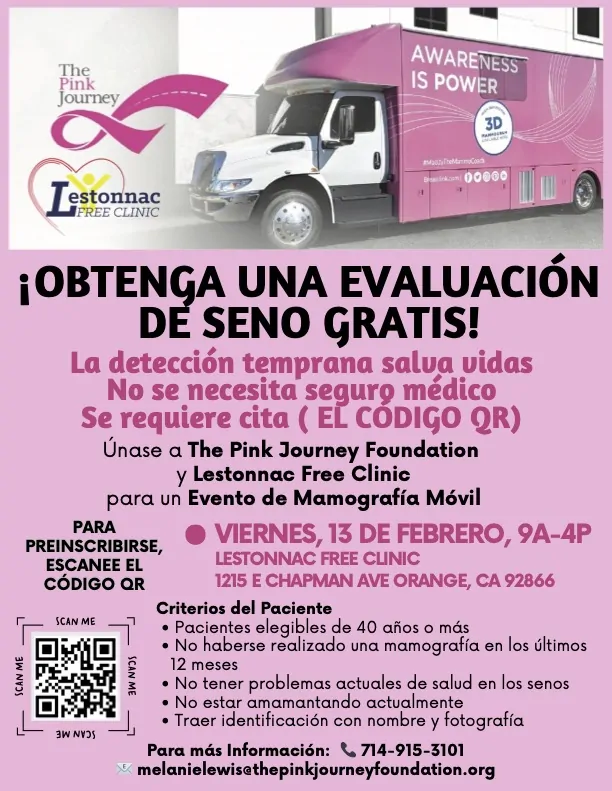 The Pink Journey Foundation will be joining the Anaheim Health Fair on Saturday, September 28 from 8am-5pm for mobile mammography.
