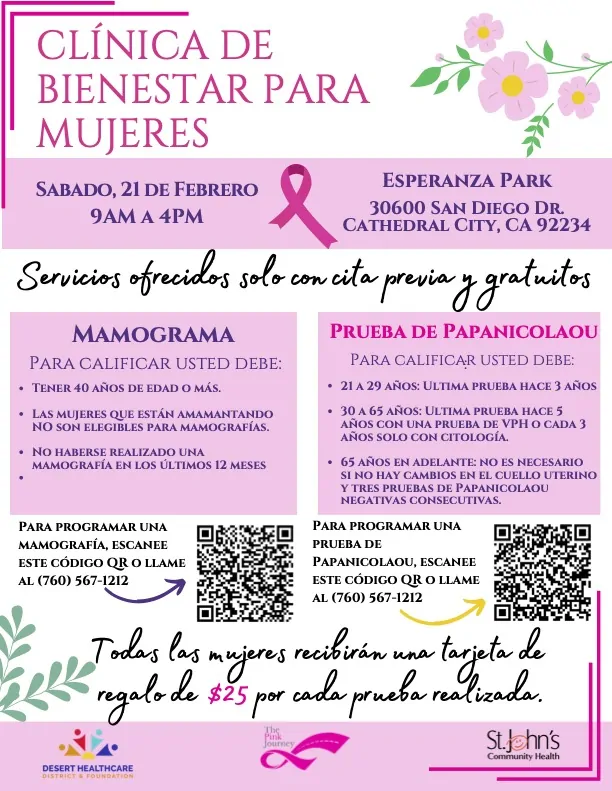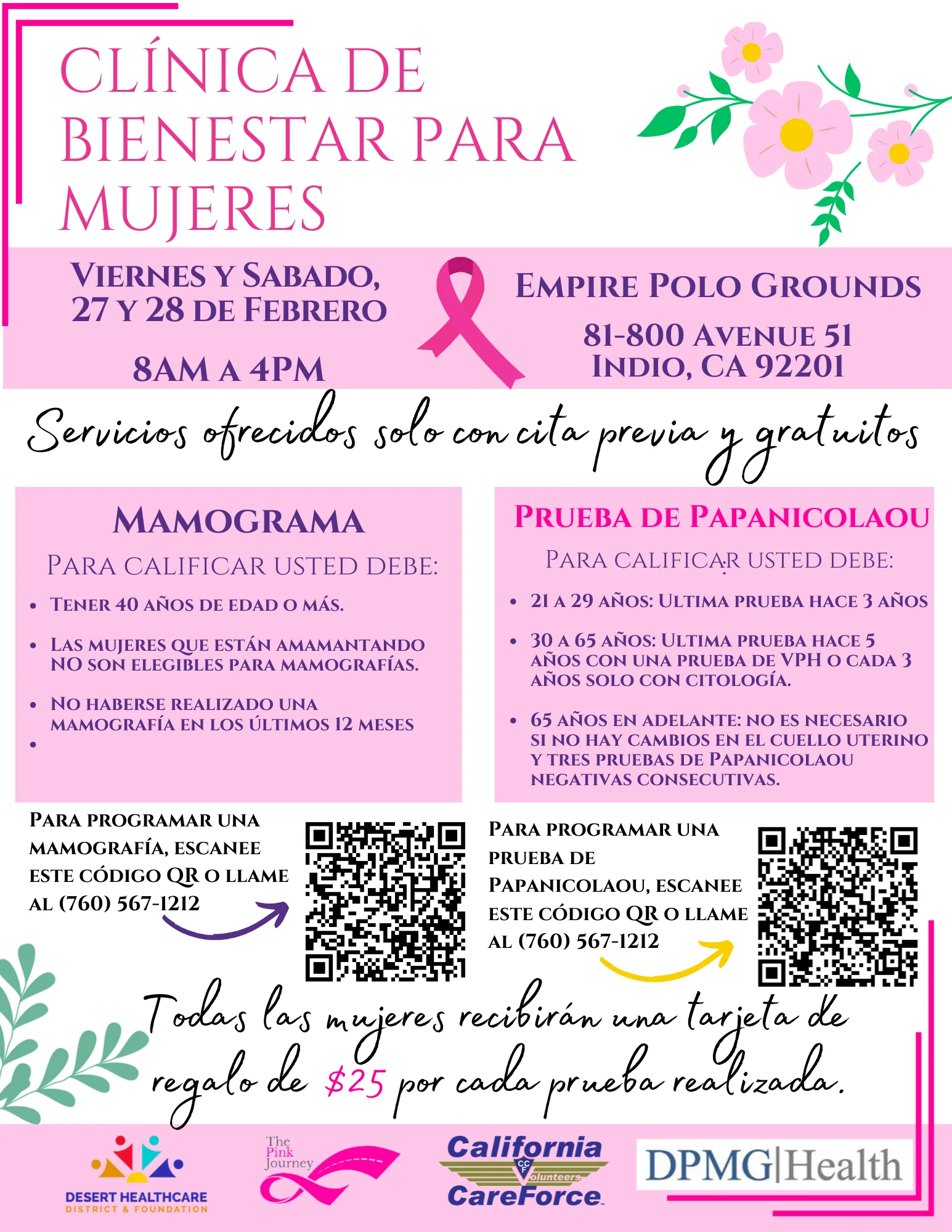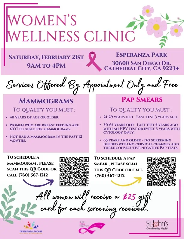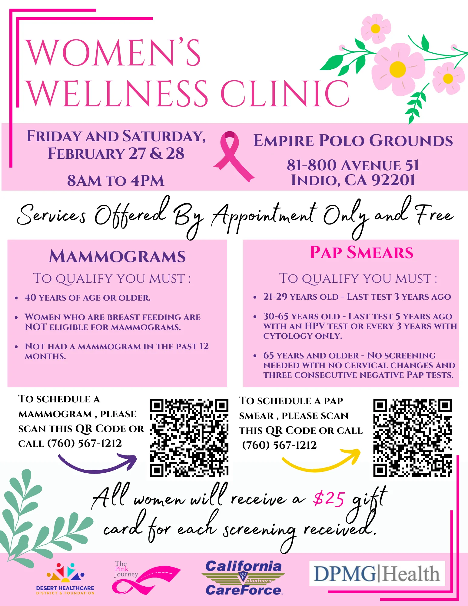 Join us at the Women’s Wellness Clinic in Desert Hot Springs for no-cost mobile mammograms for women 40 and older. You need to have an appointment to attend. See the QR code on the flyer.